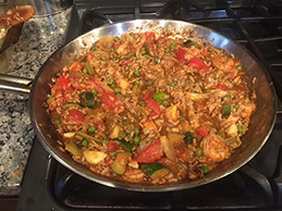 While I sauté garlic, I add frozen shrimp and frozen peas to the skillet, and mix them well together.